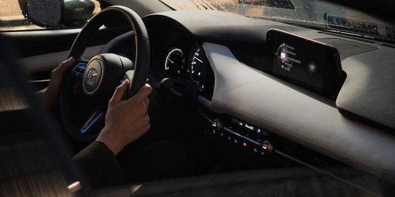 The all-new Mazda 3 is loaded with fun features that enhance the driving experience. The base model comes with a large, 7-inch display screen for the infotainment system. The screen sits prominently on the dash, providing easy line of sight, and it is controlled by a rotary knob positioned seamlessly on the center console. Mazda engineers took their time designing the controls, which have a similar design and functionality throughout the cabin. It’s a subtle feature that you will come to appreciate when you experience consistency is reactivity. You can even set your favorites for your audio settings, including station and volume.