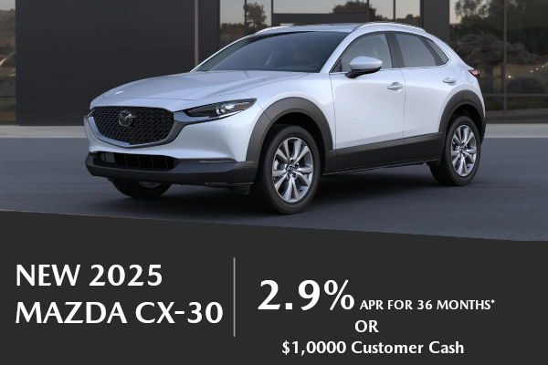 *2.9%?Annual Percentage Rate (APR) available on approved credit only for very well-qualified customers when financing a new 2026 MAZDA CX-30 through Mazda Financial Services at participating Mazda Dealers. Not all customers will qualify for credit approval or advertised APR. Amount of down payment and other factors may affect qualification. Dealer contribution may vary and could affect purchase price and amount to be financed. 36 months at $29.04 per month per $1000 financed with $0 down at participating Mazda Dealers.?Tax, title, license, other options, loan origination fees and dealer fees may apply. APR offer only available for dealers in AK, AL, AR, AS, AZ, CA, CO, CT, DC, DE, FL, GA, GU, HI, IA, ID, IL, IN, KS, KY, LA, MA, MD, ME, MI, MN, MO, MS, MT, NC, ND, NE, NH, NJ, NM, NV, NY, OH, OK, OR, PA, PR, RI, SC, SD, TN, TX, UT, VA, VI, VT, WA, WI, WV, WY regions regardless of buyer's residency. Void where prohibited. This offer is only available on participating Mazda Dealer’s current inventory, which is subject to availability. Offer ends 3/2/2026 and you must take delivery prior to expiration of offer. See participating Mazda Dealer for complete details. or $1,000 Customer Cash good towards a new 2026 MAZDA CX-30. Customer Cash is not combinable with Mazda Financial Services (MFS) Special APR or Lease Programs. Offer valid from 2/3/2026 through 3/2/2026. No cash value. Limit one discount per customer per vehicle. Must take new retail delivery from dealer stock by 3/2/2026. Residency restrictions may apply. See dealer for complete details.